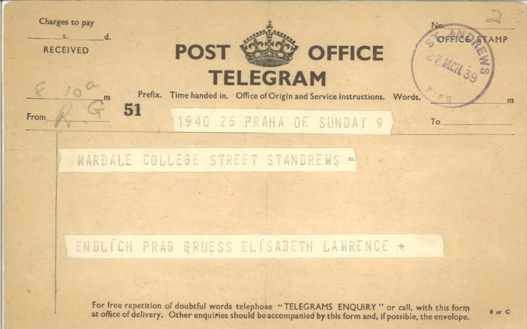 The first one is, “Can you go Prague and fetch Family Freundlich, expenses paid. Please wire.” This one is dated St Andrews, 27th March: “Endlich Prague” – Finally arrived in Prague – after several flights and train journeys and crossing borders. I even have his passport, Lawrie’s passport.